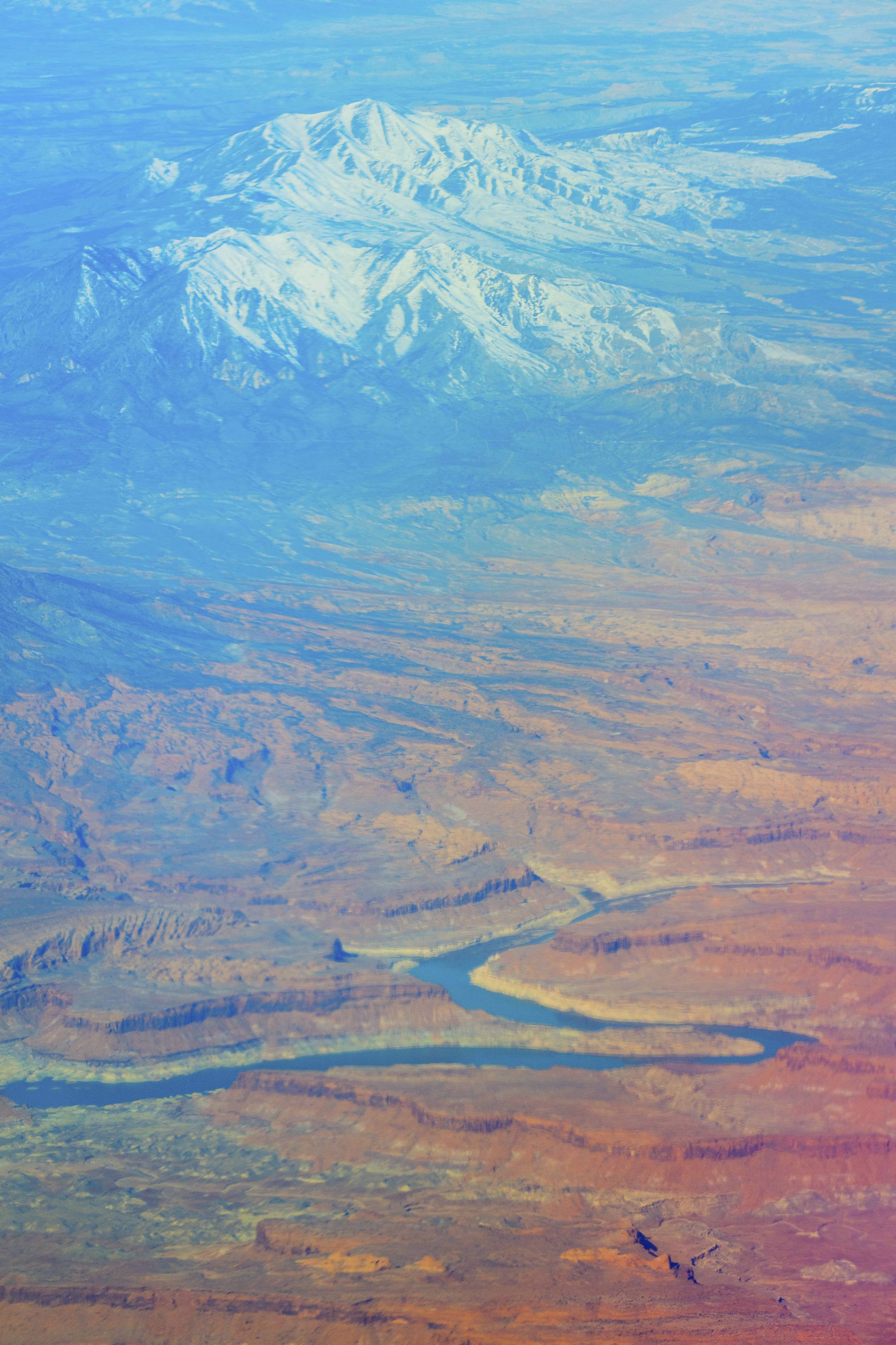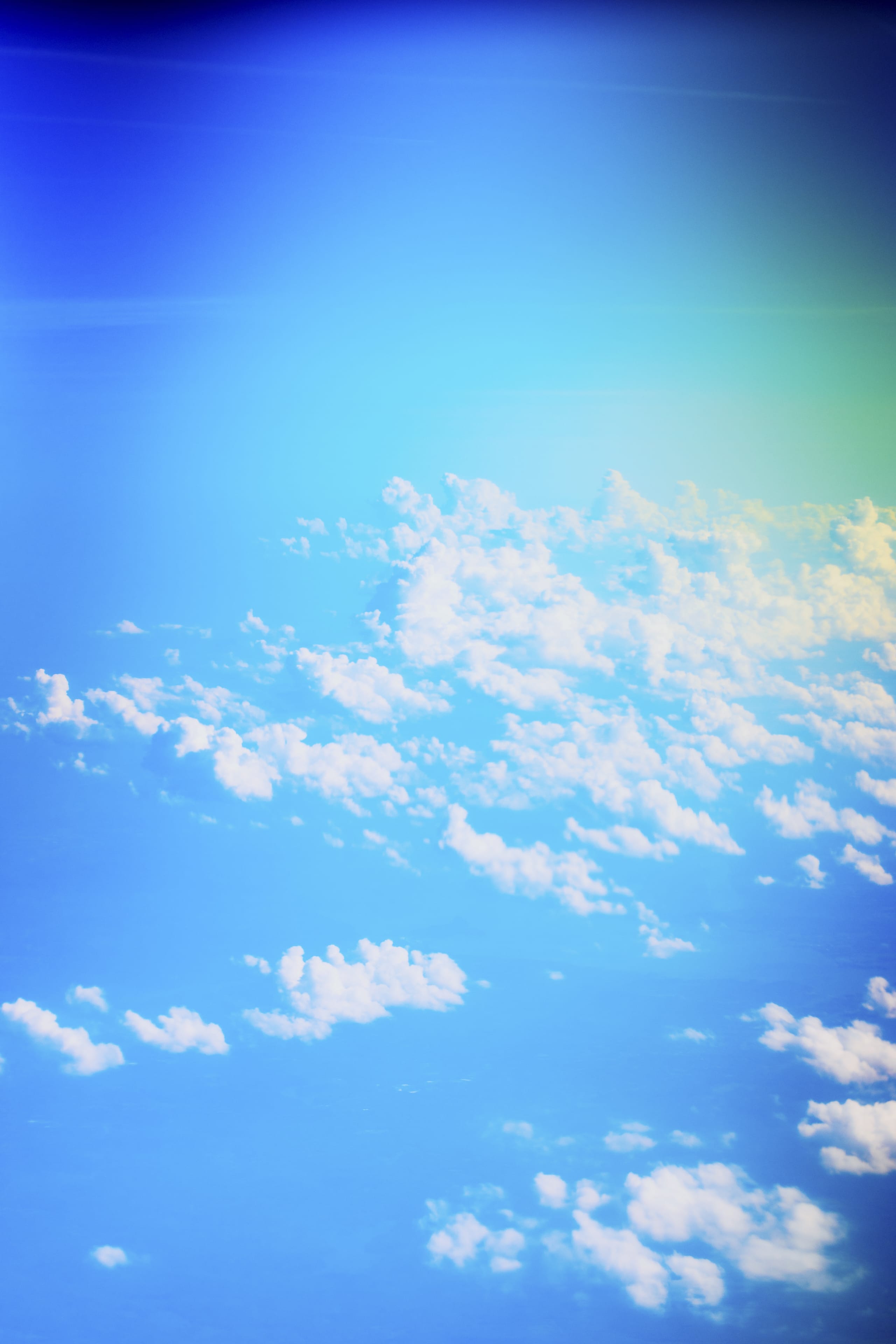 Shot at altitude, the quirks of light are due to shooting through the thick acrylic windows of the plane.