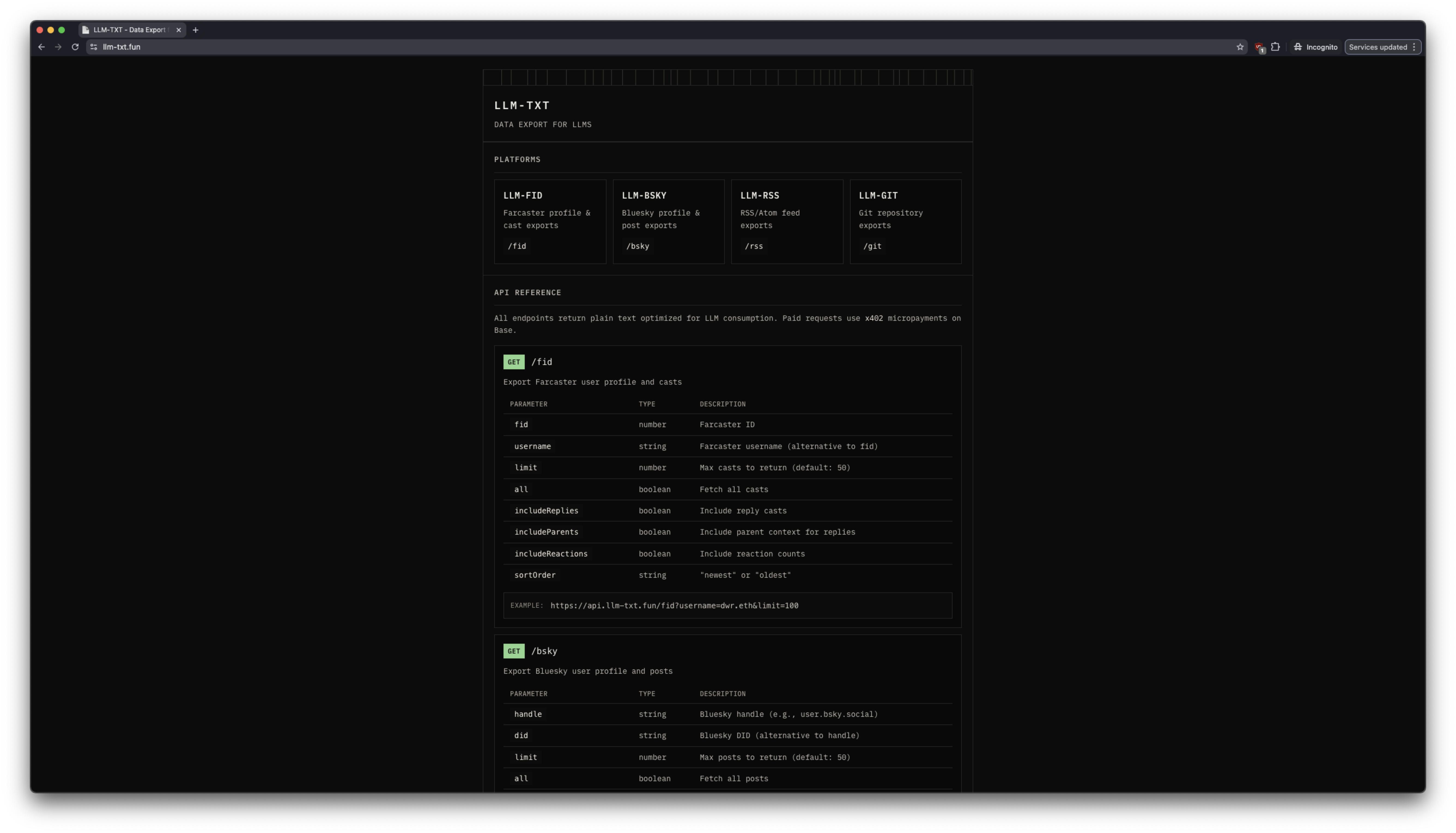 - Git repos Each tool offers some free functionality, but more complex actions require a micropayment via x402. This helps keep the lights on for more computationally intensive tasks, like paginating thousands of social posts, including replies and their parents.